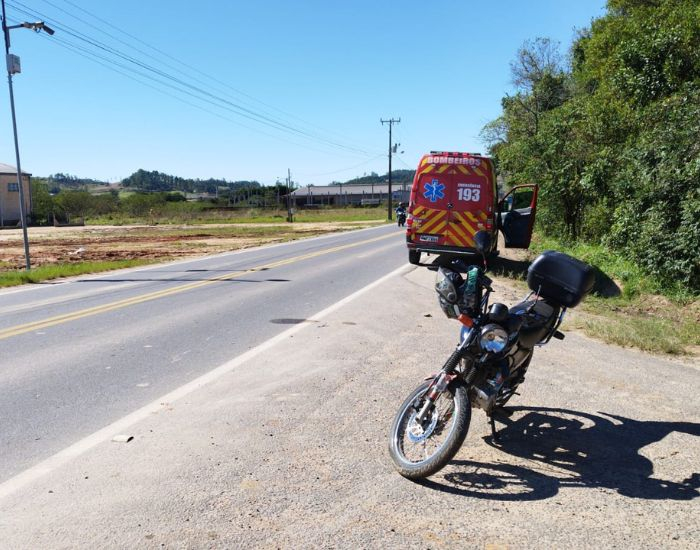 O Corpo de Bombeiros de Morro da Fumaça foi acionado e constatou uma colisão entre uma motocicleta e um caminhão na SC-443.