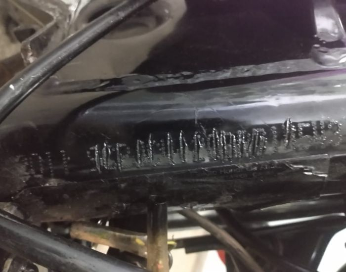 Chassi de moto adulterado (imagem ilustrativa) - Foto: PMSP/Reprodução Um jovem de 19 anos foi encaminhado à Delegacia de Polícia Civil de Jaguaruna na tarde deste domingo (25), após ser flagrado conduzindo uma motocicleta com sinais de adulteração no município de Sangão, no bairro Campo do Sangão.