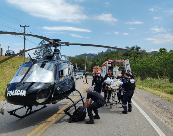 Após avaliação do médico da equipe aeromédica, a vítima foi transferida para o helicóptero, apresentando hemorragia interna e ausência de sensibilidade nos membros inferiores, com politrauma grave. Posteriormente, foi encaminhada ao Hospital de Criciúma para atendimento especializado.