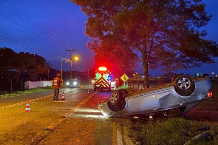 Os Bombeiros Voluntários encontraram o veículo com vazamento de combustível e fizeram o isolamento da área