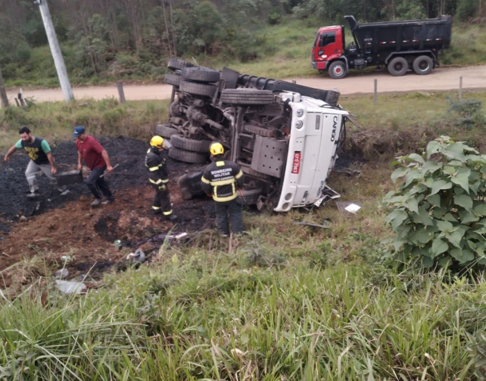 O Corpo de Bombeiros de Lauro Müller foi acionado para atender a ocorrência e constatou que um caminhão caçamba estava tombado na pista com a vítima encarcerada entre as ferragens.