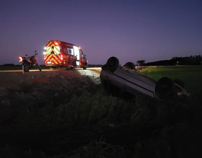 Chegando no local, a guarnição constatou uma saída de pista seguida de capotamento de um veículo Fiat Uno.