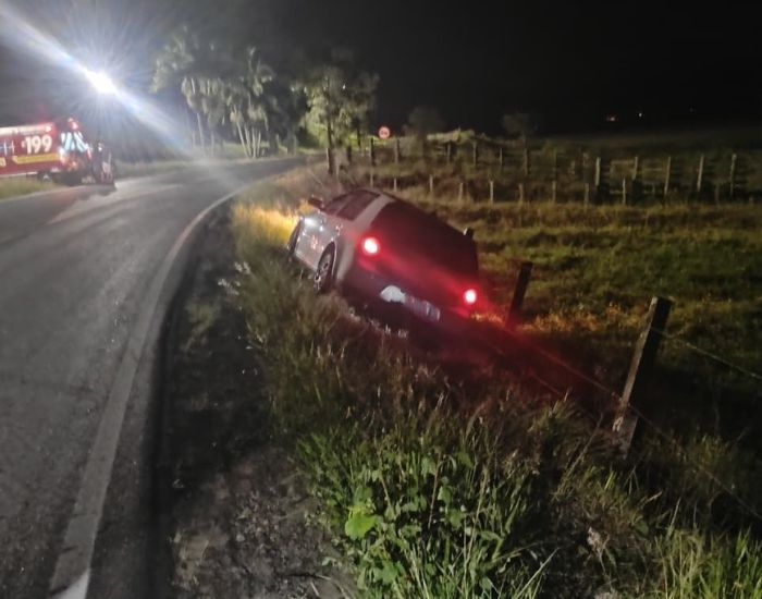 Foto: Bombeiros Voluntários de Jaguaruna Um homem de 33 anos precisou de atendimento médico após perder o controle do veículo e sair da pista na rodovia Ismael Thomaz Prevê (SC-441), no bairro São Gabriel, em Treze de Maio. A ocorrência foi registrada por volta das 21h22 deste sábado (11).