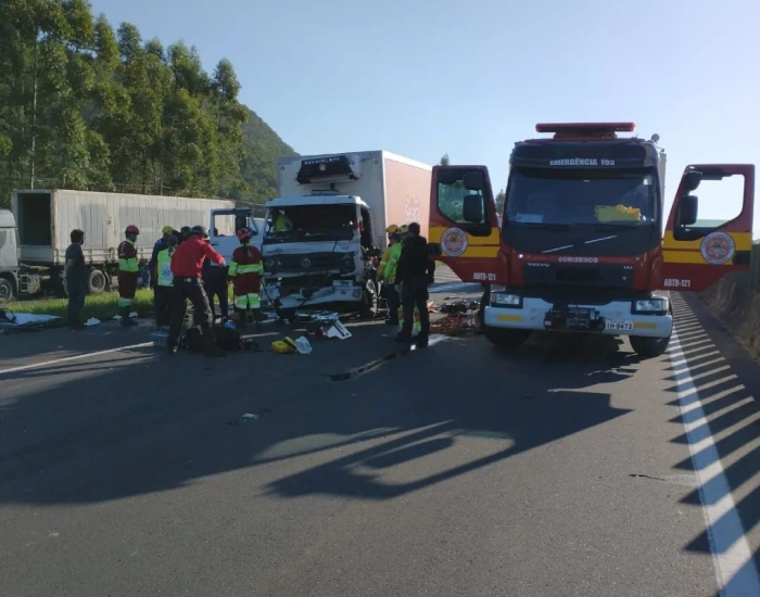 A colisão traseira deixou o motorista, de 50 anos, do caminhão baú preso às ferragens.