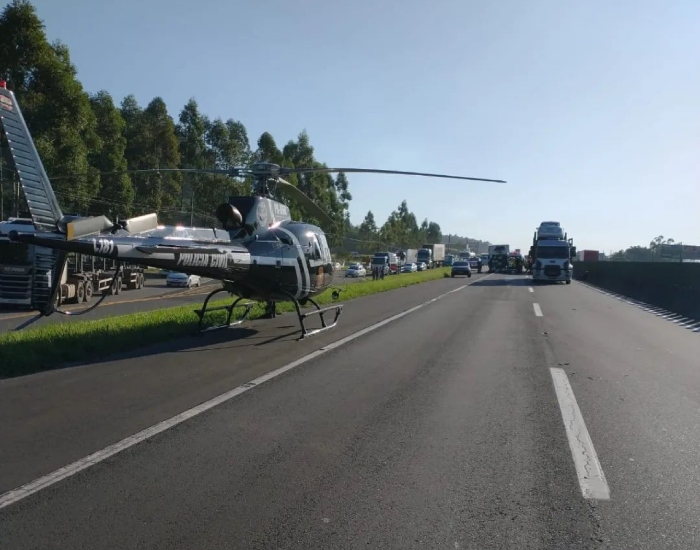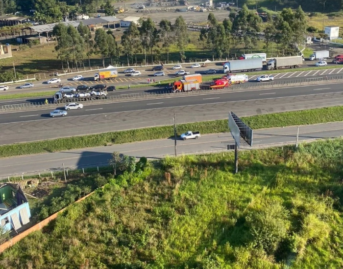 Um acidente de trânsito deixou o trânsito lento na manhã desta quinta-feira, dia 11, na BR-101, na região sul, em Maracajá. A aeronave da Polícia Civil do Saer/Sarasul foi acionada para prestar apoio no atendimento da ocorrência após colisão traseira envolvendo um caminhão cegonha carregado com carros de leilão e um caminhão baú.