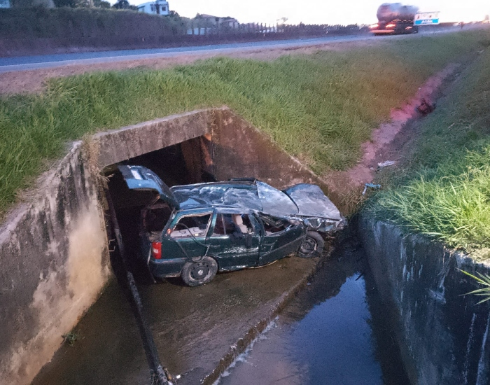 O Corpo de Bombeiros Militar de Capivari de Baixo foi acionado e constatou que um veículo saiu da pista e colidiu na galeria de drenagem da rodovia.
