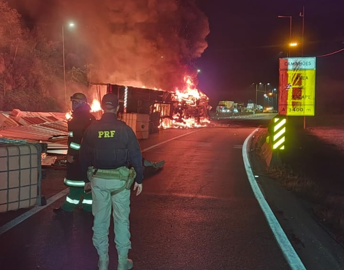 Equipes de resgate e combate a incêndios foram acionadas para controlar as chamas e prestar atendimento. A PRF (Polícia Rodoviária Federal) também está no local para orientar os motoristas e auxiliar na ocorrência.