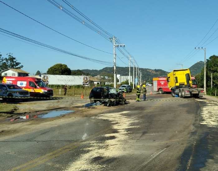 Segundo a Polícia Militar Rodoviária (PMRv) de Gravatal, com o impacto, o motorista do automóvel morreu no local. Já o condutor do caminhão saiu ileso.