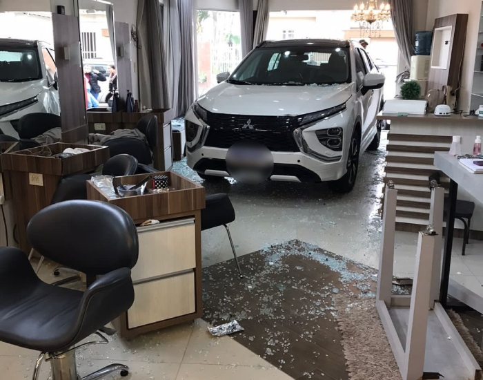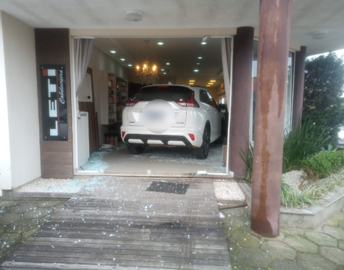 A condutora do veículo Mitsubishi Eclipse Cross relatou à Polícia Militar que foi estacionar em frente ao salão e perdeu o controle do carro.