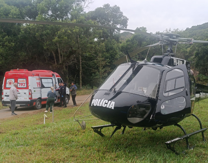 Uma mulher de 28 anos teve a perna esmagada e precisou ser resgatada pelo serviço aeromédico (Saer) na manhã deste sábado, dia 24, em Lauro Müller, no pé da Serra do Rio do Rastro.