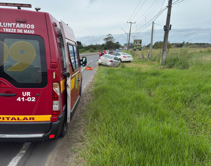 A guarnição foi até o local e no veículo Prisma, com placa de Lauro Müller, havia quatro ocupantes, o condutor de 55 anos não apresentava ferimentos e assinou recusa de atendimento.