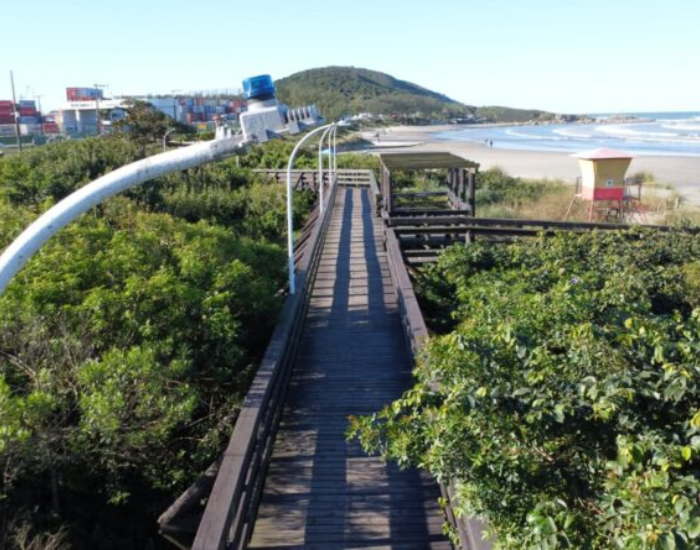 Um dos locais atingidos foi a Passarela Antonio Jerônimo de Sousa, que liga o Jangadeiro ao canto da Praia da Vila.