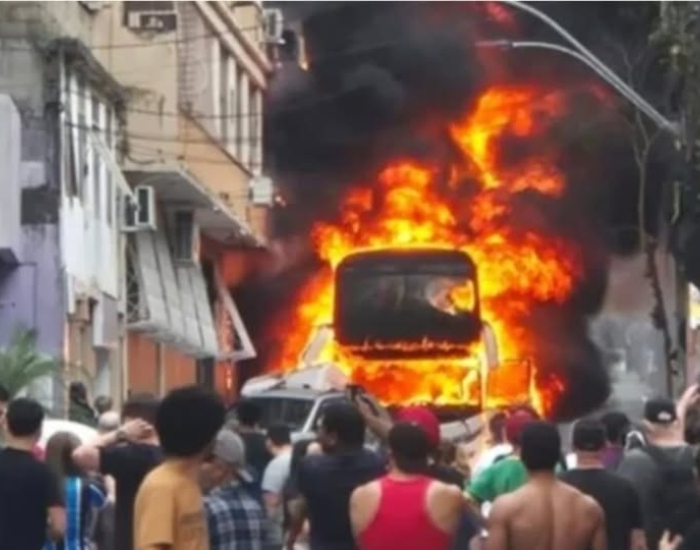 Divulgação/Folha Regional Um ônibus de turismo que transportava adolescentes pegou fogo após se enroscar em cabos de energia em Porto Alegre nesta sexta-feira, dia 3. De acordo com o Corpo de Bombeiros, o fogo foi controlado e não há vítimas.