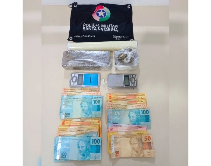 Na residência, foram encontrados 750 gramas de maconha, uma bucha de cocaína, duas balanças de precisão e 3.175 reais em dinheiro.
