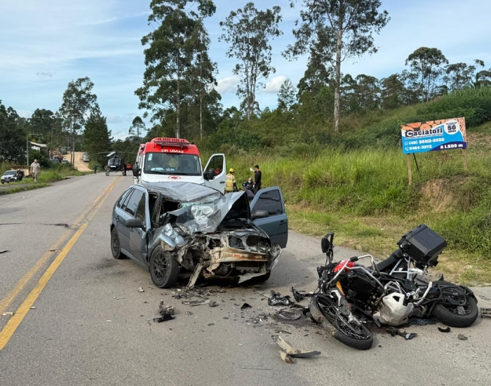 Saer/Divulgação/Folha Regional Uma mulher de aproximadamente 30 anos morreu após um grave acidente de trânsito na SC-446, em Lauro Müller, nesta terça-feira, dia 14. Ela estava na carona de uma motocicleta de alta cilindrada que colidiu contra um automóvel na rodovia.