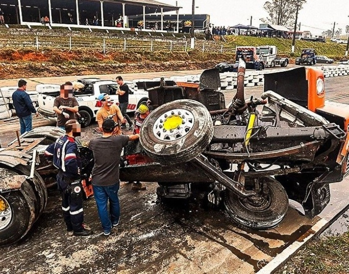 Um piloto identificado como Dodi Amaro, saiu ileso de um grave acidente durante o Campeonato Sul Brasileiro de Arrancada de Caminhões, neste domingo, dia 1º, em Morro da Fumaça.