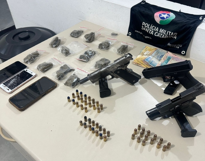 Diante do flagrante, foi realizada a entrada no imóvel. Na cama havia duas pistolas carregadas ao lado de um homem, além de munições. Foram apreendidas uma pistola imbel 380, com 19 munições, uma pistola Taurus 638 com 15 munições, além de 14 munições sobressalentes e a quantia de R$ 1.334,00 em dinheiro.