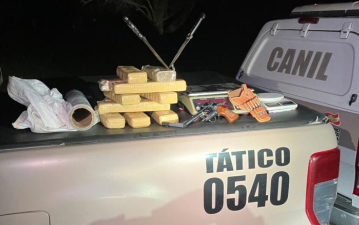 O proprietário da droga tem mandados de prisão ativos e fugiu em direção à mata. Revólver, facas e munições também foram apreendidos na residência