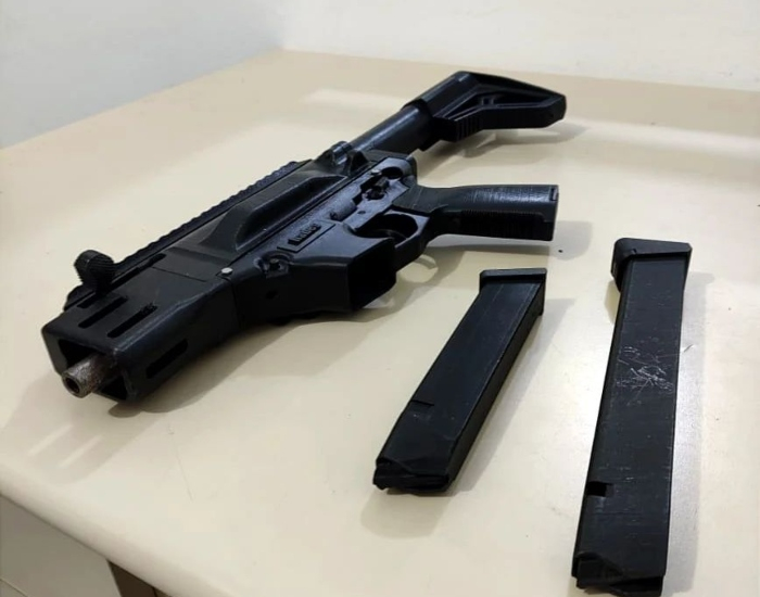 A polícia localizou uma arma de fogo, carabina calibre 9mm, de fabricação caseira, com dois carregadores