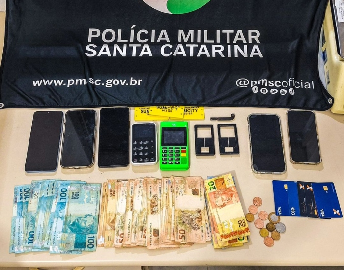 Com os abordados e no interior do veículo, foram encontrados R$ 5.136,15, além de equipamentos utilizados para alterar caixas eletrônicos, quatro máquinas de cartão de crédito e cartões furtados. Um deles, pertencente a uma vítima que ainda estava na agência bancária e relatou ter perdido seu cartão, que havia ficado preso no interior do caixa eletrônico.