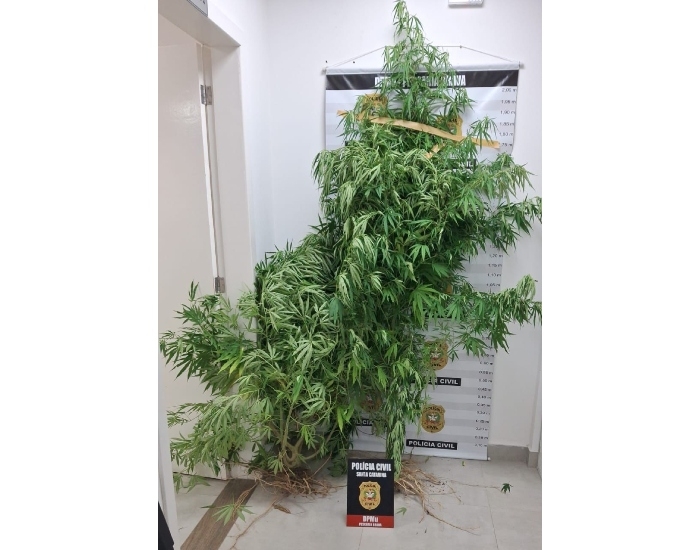 Com a informação, a guarnição foi até o bairro Taquaraçu, em Pescaria Brava, onde localizou e apreendeu dois pés de maconha de grande porte que estavam sendo cultivados no quintal da residência.