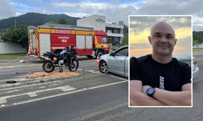 Fotos: Corpo de Bombeiros e Divulgação O policial militar Maurício Menegaz, 41 anos, de Tubarão, morreu neste domingo (5) após um grave acidente na SC- 370, em Gravatal, na localidade de Termas. Ele conduzia uma motocicleta BMW F 850 GS quando bateu em um Chevrolet Cruze Sedan.