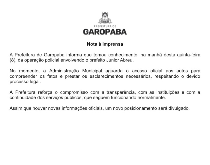 “A Prefeitura de Garopaba informa que tomou conhecimento, na manhã desta quinta-feira (8), da operação policial envolvendo o prefeito Junior Abreu. No momento, a Administração Municipal aguarda o acesso oficial aos autos para compreender os fatos e prestar os esclarecimentos necessários, respeitando o devido processo legal. A Prefeitura reforça o compromisso com a transparência, com as instituições e com a continuidade dos serviços públicos, que seguem funcionando normalmente. Assim que houver novas informações oficiais, um novo posicionamento será divulgado”.