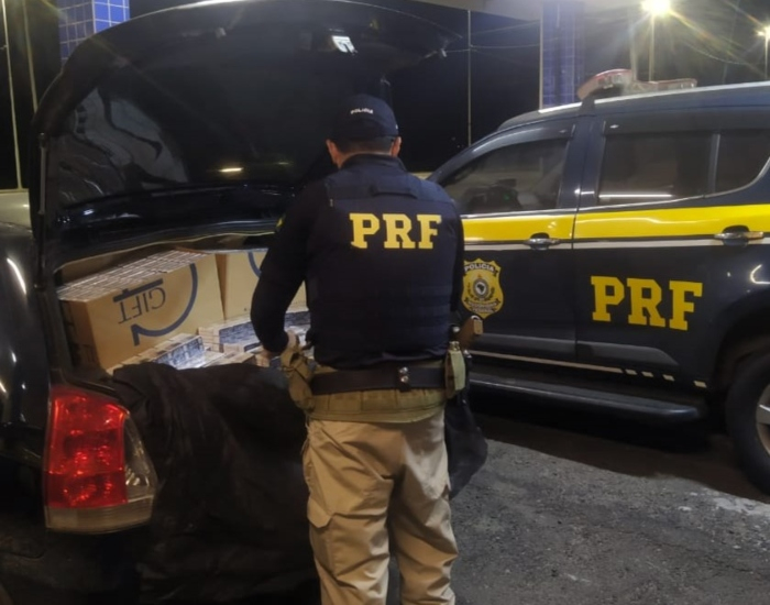 Os agentes deram ordem de parada à condutora de um carro com placas de Sapiranga/RS, que não obedeceu e tentou fugir. Cerca de dois km à frente, os PRFs realizaram a abordagem e encontraram os maços de cigarros escondidos por um plástico preto no porta-malas do veículo.