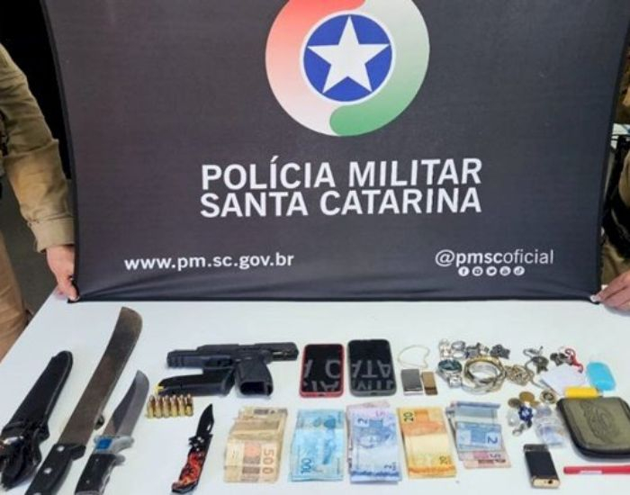 A arma, segundo a PM, tinha registro de furto em Xaxim. No total, foram apreendidos uma pistola, 11 munições intactas, três deflagradas, quatro armas brancas, dois celulares e um veículo.