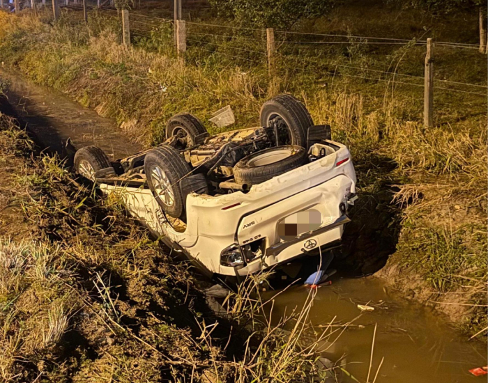 CBMSC/Divulgação/Folha Regional Um veículo Toyota Hilux SW4 com placas de Cocal do Sul capotou após saída de pista na noite deste domingo, dia 17, na SC-443, no bairro Naspoline, em Morro da Fumaça.
