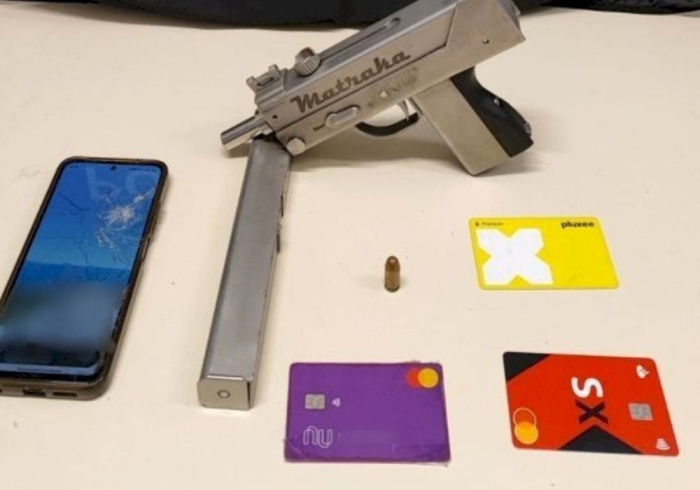 Os policiais se deslocaram até o endereço indicado, onde localizaram uma submetralhadora cromada artesanal, com carregador alongado e uma munição intacta. O armamento não possuía marca nem número de série, o que reforça sua produção clandestina.