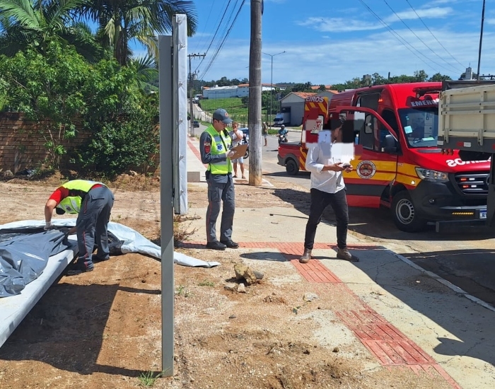 O homem tentava fixar a placa quando a estrutura se inclinou sobre ele