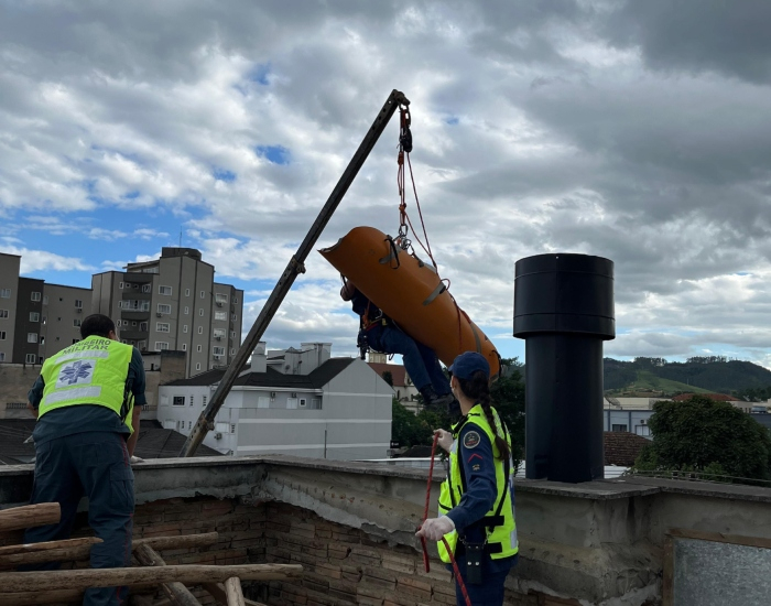 A vítima foi içada com auxílio de cordas até o chão. Após atendimento, foi encaminhada ao hospital