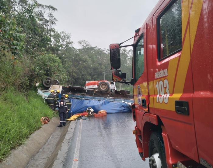 O Corpo de Bombeiros foi acionado e constatou que um caminhão carregado de grãos de milho capotou na via, derrubando a carga. A pista foi interditada para atendimento no local. O motorista foi encontrado já fora do veículo. Já a pessoa que estava como carona, ficou encarcerada entre as ferragens.