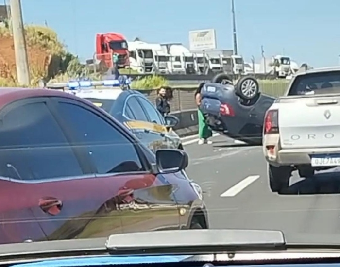 Divulgação/Folha Regional Um veículo Renault Sandero de Balneário Pinhal/RS capotou na BR-101 no Km 349, sentido sul, em Jaguaruna, nesta quarta-feira, dia 5, após o motorista perder o controle da direção.