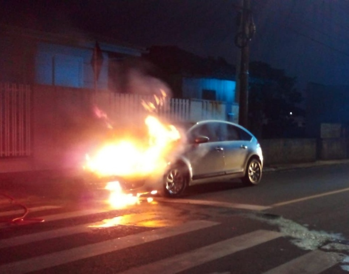 BVJ/Divulgação/Folha Regional Um veículo Citröen C4 foi destruído por um incêndio na noite desta terça-feira, dia 29, na Rua Esnesto Lacomb, no Centro de Jaguaruna.