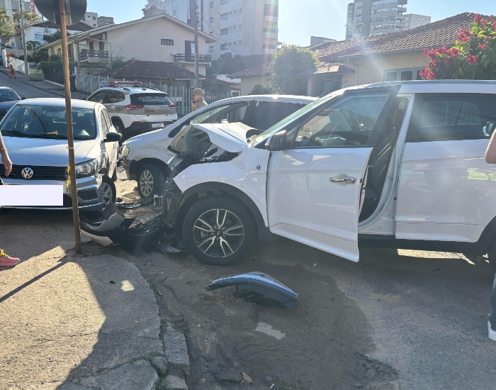 Um dos automóveis descia pela Rua Recife quando foi atingido por outro veículo. Com o impacto da batida, um terceiro veículo que estava estacionado também foi atingido.