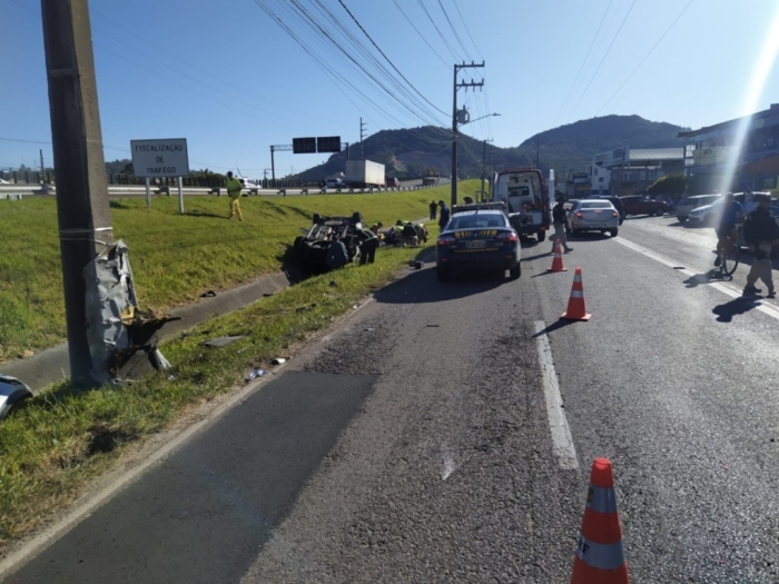 Uma colisão traseira seguida de capotamento foi registrada nesta terça-feira, dia 15, no Km 335, da BR-101, sentido sul, em Tubarão.