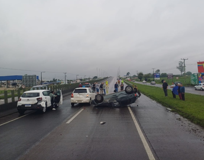 Um dos veículos chegou a capotar na pista. A ocorrência foi atendida pelo Corpo de Bombeiros, CCR ViaCosteira e Polícia Rodoviária Federal (PRF).