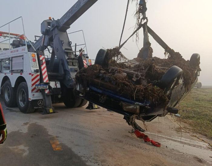 Ao chegar no local, foi constatado que se tratava de um automóvel modelo VW Gol com placas de Criciúma que havia perdido o controle, saiu da pista, capotou e caiu no rio, ficando submerso.