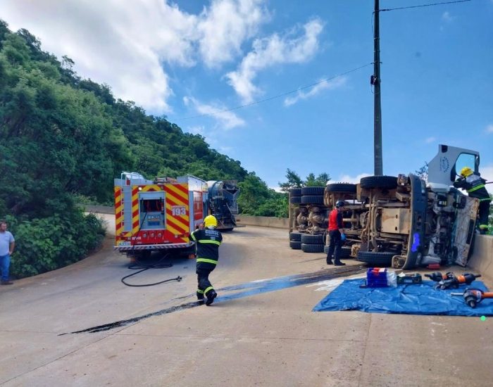 O Corpo de Bombeiros foi acionado e constatou que o motorista conduzia um caminhão betoneira, que tombou lateralmente, ficando a cabine prensada junto ao guard-rail de concreto. A vítima foi encontrada pela guarnição consciente, orientada e com as pernas presas na carroceria retorcida do caminhão.
