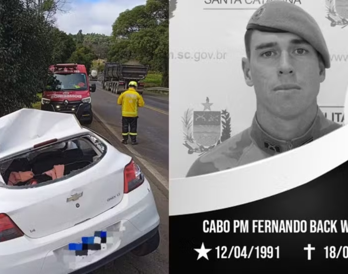 Com a força da colisão, o carro ficou destruído e o caminhão entrou parcialmente em um açude. O cabo Fernando Back Weigel, que morreu no acidente, atuava no batalhão da PM de Brusque, no Vale do Itajaí.