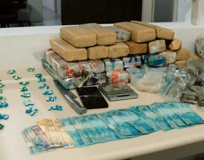 No total, foram apreendidos 21,230 quilos de maconha, 59 gamas de MD, 294 compridos de ecstasy, 44 gramas de haxixe, 445 gramas de skank e R$ 2.544.