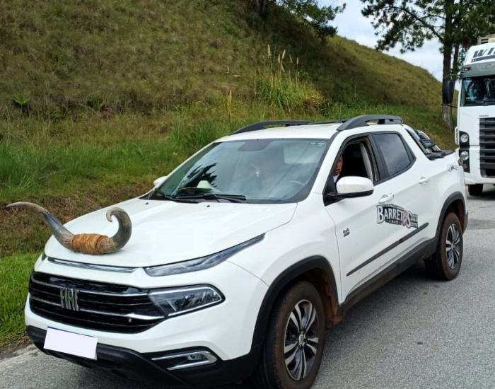 Divulgação/Folha Regional Durante fiscalização de freios em veículos de carga, policiais rodoviários federais flagraram um “chifre de boi” instalado na ponta do capô dianteiro de uma picape. O caso curioso ocorreu na sexta-feira (30) na BR-282, em Rancho Queimado.