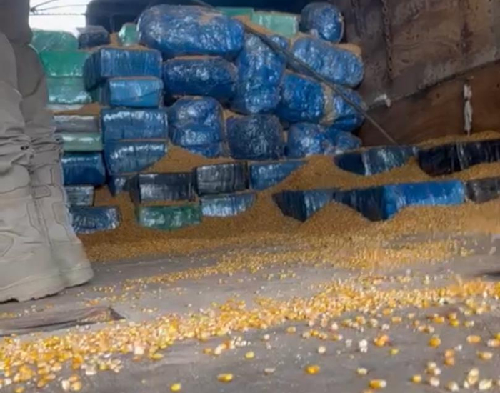 Diante das suspeitas, os PRFs resolveram inspecionar a carga de milho a granel, e logo encontraram vários pacotes escondidos sob os grãos.