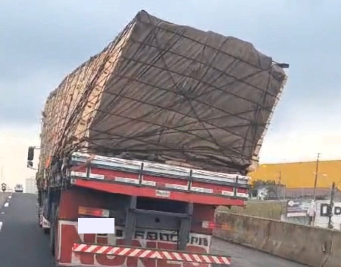 A conduta configura infração grave (multa de R$ 195,23). O caminhão seguiu viagem somente após o transbordo da carga pendente para outro veículo.
