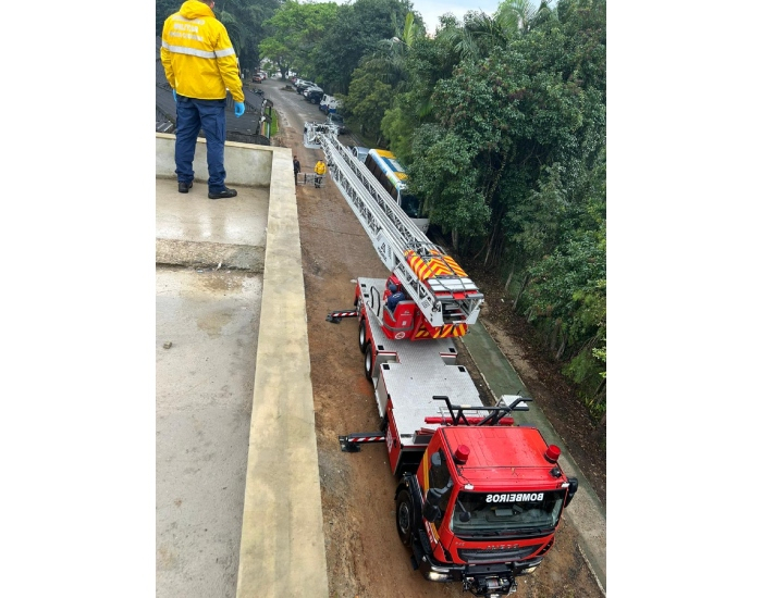 Por conta da altura da edificação e do difícil acesso ao local, bem como da necessidade de se imobilizar a vítima, a equipe optou por retirá-la em maca rígida com o uso da escada Magirus. Posteriormente, já em solo, a vítima foi encaminhada ao hospital pela unidade do Samu.