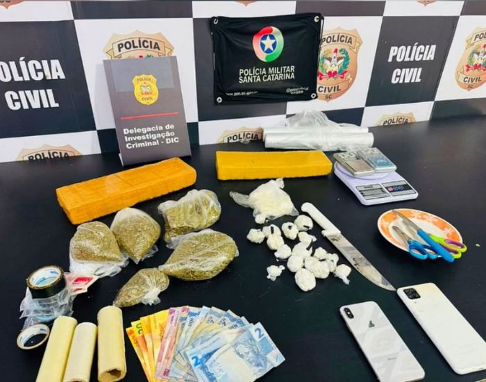 Foto: Polícia Militar Uma operação conjunta da Polícia Militar e da Delegacia de Investigação Criminal resultou na apreensão de drogas, armamento e dinheiro, além da prisão de dois homens, na manhã desta segunda-feira (26), em Tubarão.