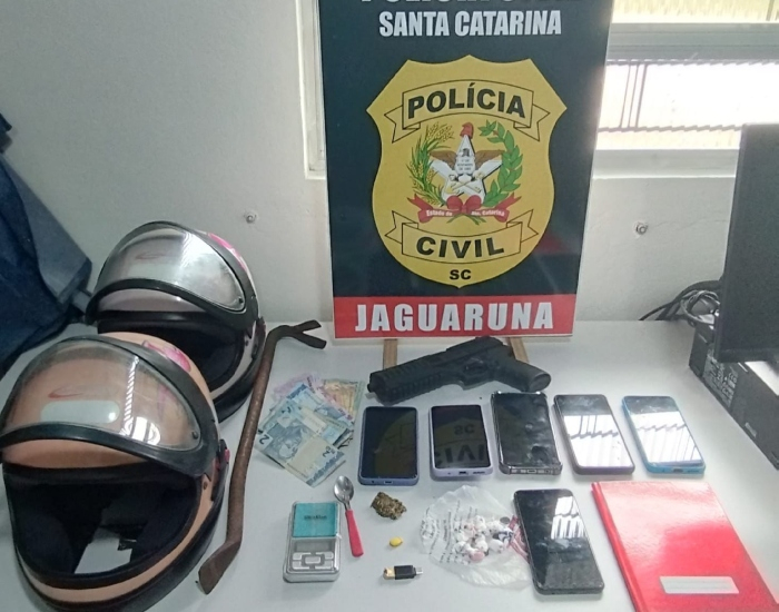 PCSC/Divulgação/Folha Regional Quatro pessoas foram presas em flagrante por tráfico de drogas e envolvimento em um roubo de um supermercado ocorrido no mês de janeiro, em Jaguaruna.