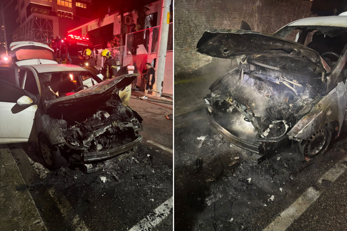 Fotos: Corpo de Bombeiros Um carro pegou fogo na noite desta terça-feira (24), na Rua Vidal Ramos, próximo ao Hospital Nossa Senhora da Conceição, no Centro de Tubarão. Mãe e filha, que estavam no veículo quando o incêndio começou, conseguiram sair a tempo.